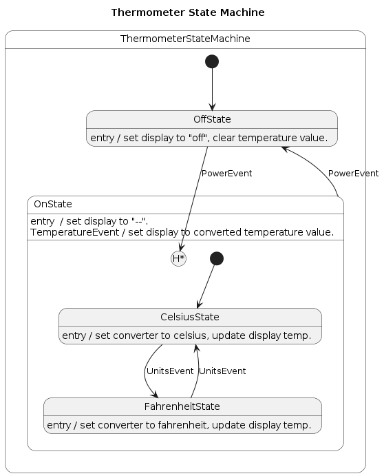 For a more complicated example, consider a transition from OnState to OffState due to a PowerEvent. In this case, the common parent is ThermometerStateMachine. However the active state is a substate of OnState, say FahrenheitState, in this case.