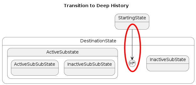 In the above diagram, a transition to deep history from StartingState to DestinationState will actually transition to ActiveSubSubState, assuming, as its name suggests, that ActiveSubSubState was the last active sub-substate under DestinationState before the transition to deep history.