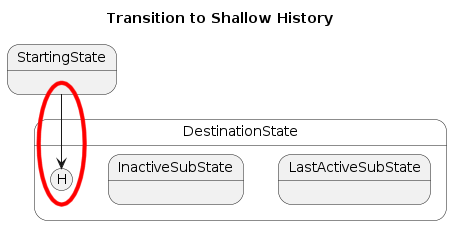 In the above diagram, a transition to shallow history from StartingState to DestinationState will actually transition to LastActiveSubState, assuming, as its name suggests, that LastActiveSubState was the last active substate under DestinationState before the transition to shallow history.