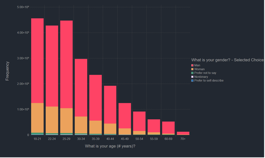 As you would expect the bulk of the respondents, almost 60% infact, are between 18–30s. Not particularly surprising given the respondents would be mostly Kaggle users themselves, though I suspect there's some disconnect here between the survey and actual industry trends. This is of course, just baseless speculation, so don't take it too seriously.