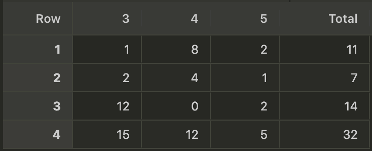 Let's create the contingency table of the number of gears and the number of cylinders. Both of these variables are interpreted as Integers, but their values are discrete and, clearly, categorical in nature.