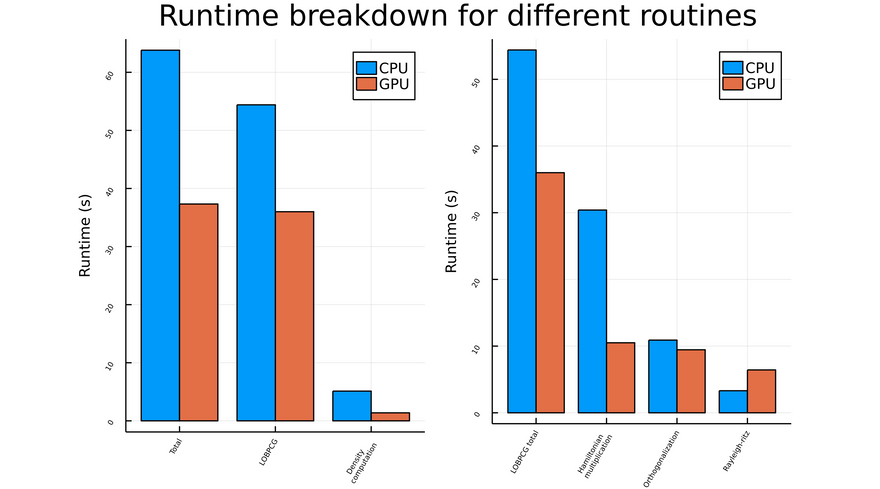 It is also worth noting that runtimes behave very differently from one example to another. For smaller systems, I noticed a speedup of up to 3, whereas for larger systems the speedup tends to fall down around 1.5: this is likely due to MKL's efficient parralelization for large systems. The GPU speedup we see is still interesting, especially considering that I have not written any tailored kernel specific for the algorithms, and have only build upon the existing functionalities in Julia.