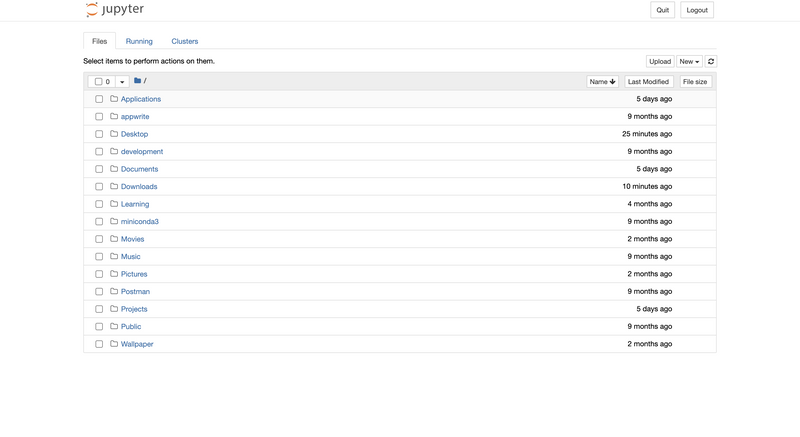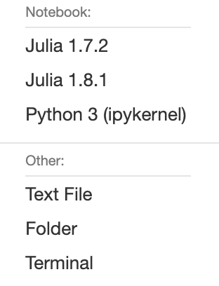 Clicking on the “New” dropdown would give you options for the available notebooks. For example, I have Notebooks Julia 1.7.2 and 1.8.1 installed. There is also a Python3 notebook available.