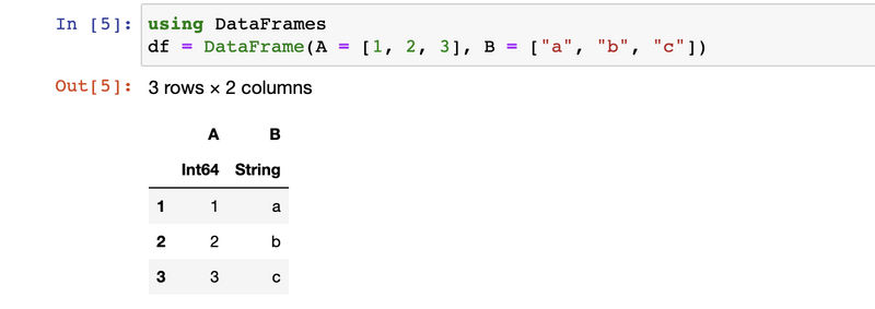 IJulia also supports viewing and manipulating tables. To create a table, first install the DataFrames.jl package by running the following command in a new cell: