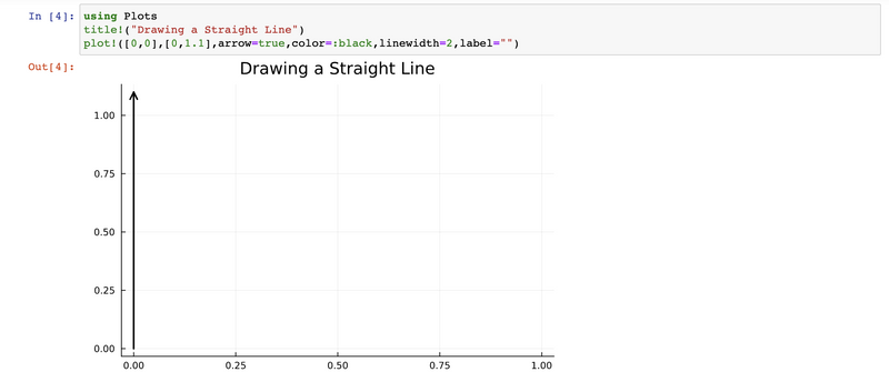 using Plots title!("Drawing a Straight Line") plot!([0,0],[0,1.1],arrow=true,color=:black,linewidth=2,label="")Which would give a result below