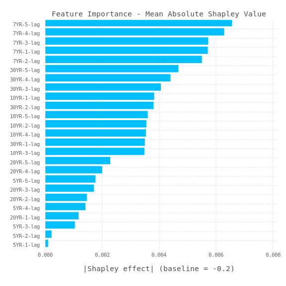 Then, plot the Mean Absolute Shapley Value with the Gadfly.jl