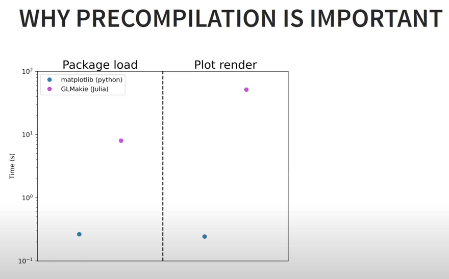 Interestingly, time showcased that for package loading, Python is still an order of magnitude faster than Julia and for plot rendering, it is 2 orders of magnitude. This is a huge deal and again something that people have long said makes them not comfortable switching to Julia. To hear about Tim and Valentin's solution to some of these issues, check out the full talk: