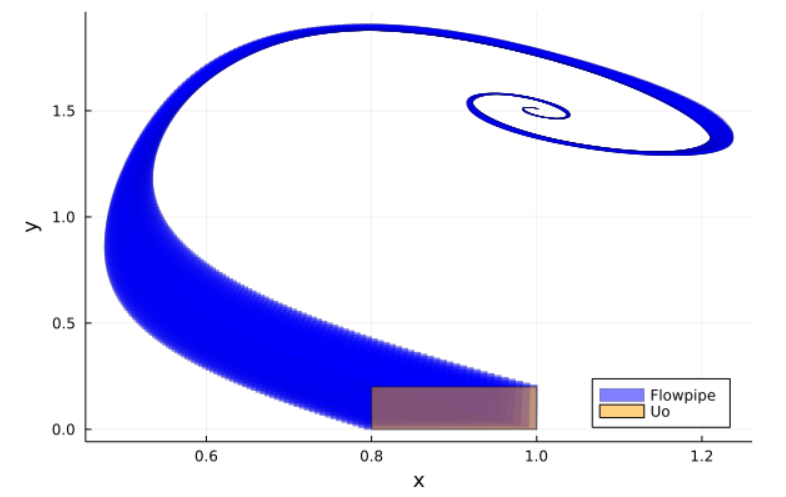 Using LazySets.jl we are able to get more accurate estimates in ReachabilityAnalysis.jl, for example the picture in the previous paragraph obtained using LazySets.jl and ReachabilityAnalysis.jl
