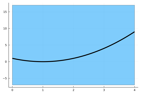 Now you may be wondering, isn't this what interval arithmetic does? Do you need a whole package for it? The answer is yes and no. It is true that interval arithmetic (assuming it's properly implemented) will give you a rigorous enclosure. That is, opening a Julia REPL and evaluating the function with IntervalArithmetic.jl will give you an interval which is probably bigger than the true range. Observe the following picture, where the function is evaluated with interval arithmetic.