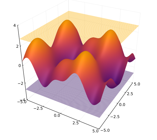 RangeEnclosures.jl is a package to rigorously bound function ranges. That is if you have a function and you want to evaluate the function over a rectangle domain you want to compute an interval . The following pictures give a visualization of the range bounding concept.