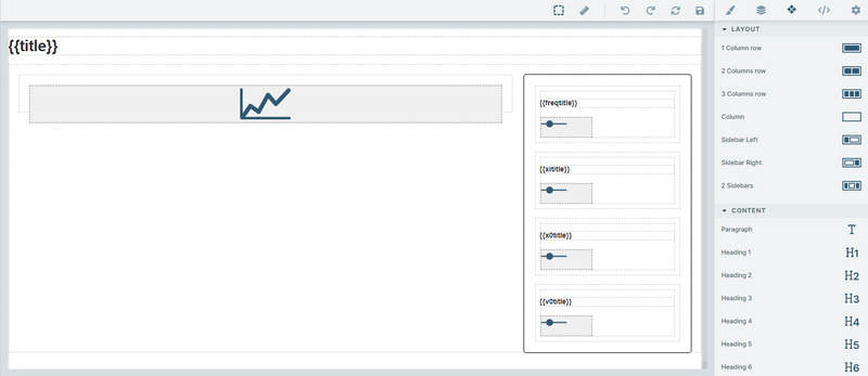 Layout -> Sidebar rightelement of the no-code editor. In the left column, a line plot has been inserted using theCharts -> Lineelement of the editor. The right column requires more work, since it contains 4 sliders, each of them having a title. Each slider is created using the following procedure:a. Use