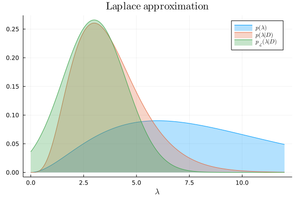 plot!(λ, laplace_approx, lab=L"p_{\mathcal{L}}(\lambda|D)", title=L"\textrm{Laplace~approximation}")