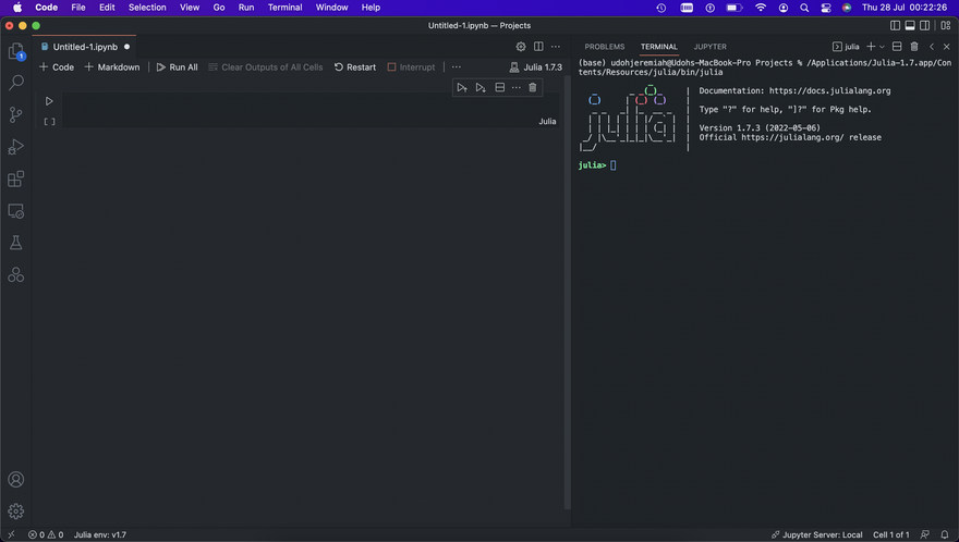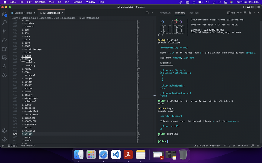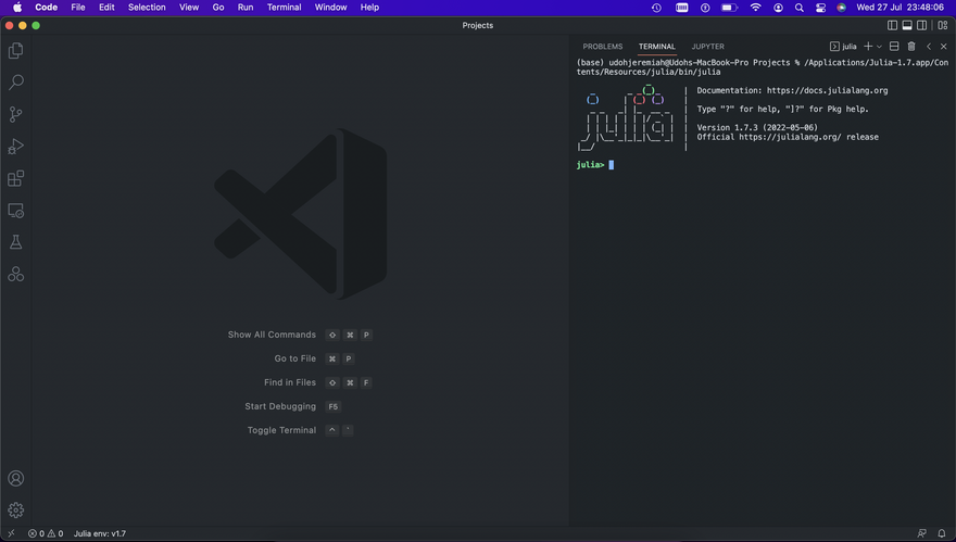 .txtfile extension (so it can be opened up in VS Code), then ALWAYS keep it open in your VS Code environment when working with Julia as well as the Julia REPL on the terminal in the right hand side, this would make your workflow so swift.