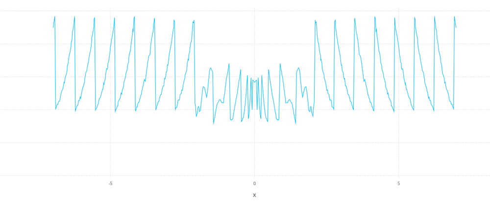 If we tried to, say, evaluate the error in ULPs on an evenly-spaced grid on the chosen interval, the plot would just like like noise if each evaluation was plotted as a data point. However, given that the worst cases are what is most interesting, it might be possible to achieve a comprehensible visualization by giving up on visualizing the best cases. In other words, we're interested in the upward spikes of the error, and by eliding the downward spikes it might be possible to make the plot a lot less noisy.