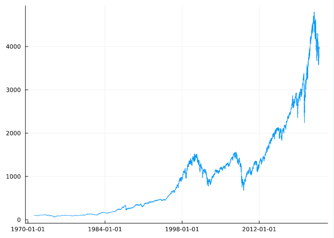It loads the most recent publicly available data on equity prices from Yahoo finance. In an ideal world, weād like any updates to these inputs to be reflected in our output. That way you can just re-render the Quarto notebook to get an updated report. To render Julia code inline, we use Markdown.jl like so: