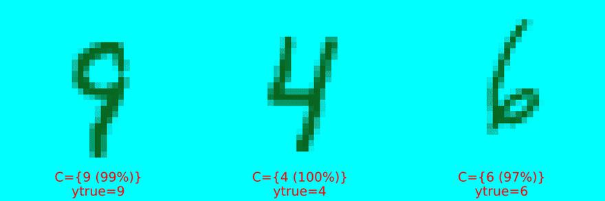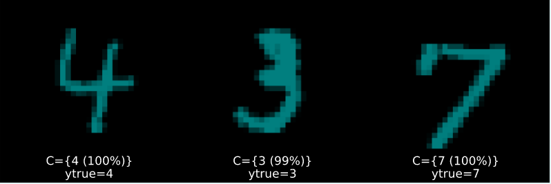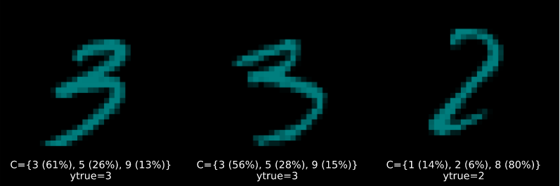 Figure 2 (b) and Figure 2 (c) display increasingly uncertain predictions of set size two and three, respectively. They demonstrate that CP is well equipped to deal with samples characterized by high aleatoric uncertainty: digits four (4), seven (7) and nine (9) share certain similarities. So do digits five (5) and six (6) as well as three (3) and eight (8). These may be hard to distinguish from each other even after seeing many examples (and even for a human). It is therefore unsurprising to see that these digits often end up together in conformal sets.