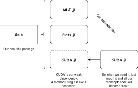 Our first approach was to implement all the changes related to integrating MLFlowClient using package extensions. This bleeding edge feature was introduced in Julia 1.9, inheriting the functionality implemented by a package named Requires. In simple terms, this allows us to include external dependencies without including them... that sounds weird, right? Well, it's very simple.