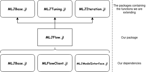 After our concerns, Anthony suggested to create a new package that joins all the MLJ components and MLFlowClient... what a great idea! This allowed different things that package extensions make difficult: