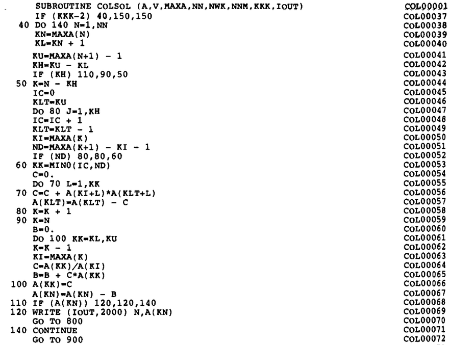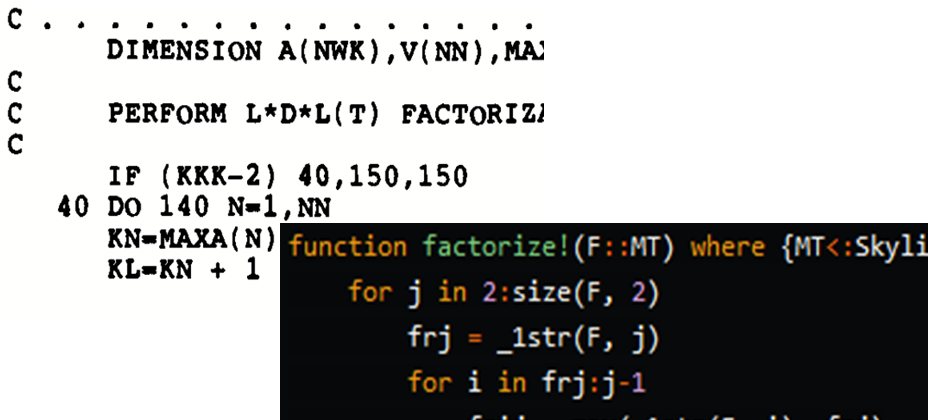 For a long time, the textbook by Bathe1 served as a reference of the implementation (page 448). Figure 2 shows the Fortran code of the envelope-matrix factorization (originally in Fortran IV, later modified to Fortran 77) from this book.