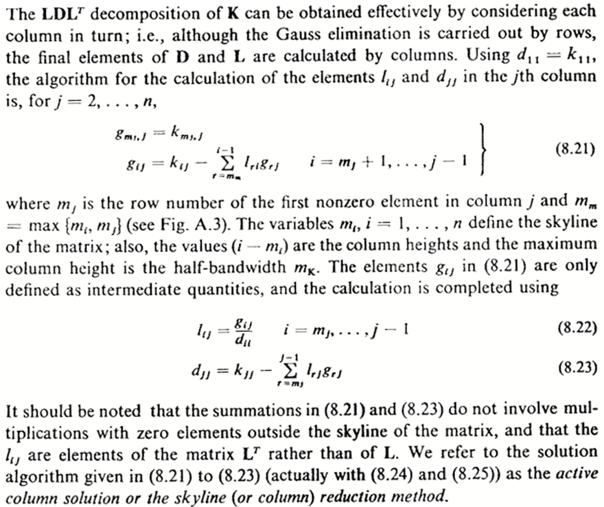 The textbook by Bathe1 describes a sophisticated version of the Gauss elimination which operates on the upper triangle of the matrix, producing the entries of the LT factor and the entries of the diagonal D. Figure 1 below is the complete description of the algorithm.