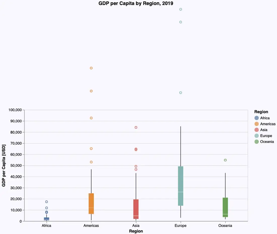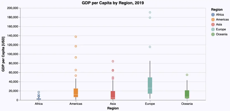 To obtain an insight into the distribution of some numerical data, box plots or violin plots are typically used. Each of these diagram types has its specific virtues. So letās visualize the distribution of the GDP per capita for each region using these plots.