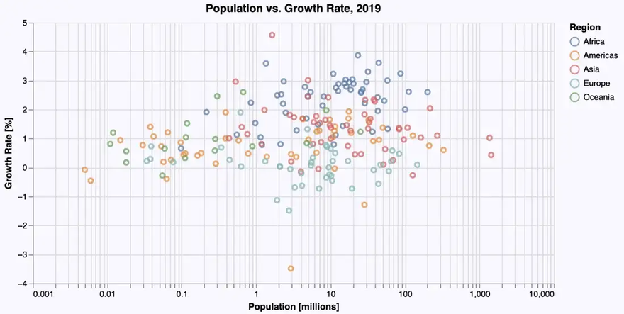 But the distribution of the data is quite skewed ā most countries have a population below 200 Mio. So a logarithmic scale on the x-axis might give a better insight into the data. And again, we add some labels, background color etc. leading to the following code: