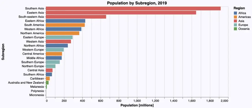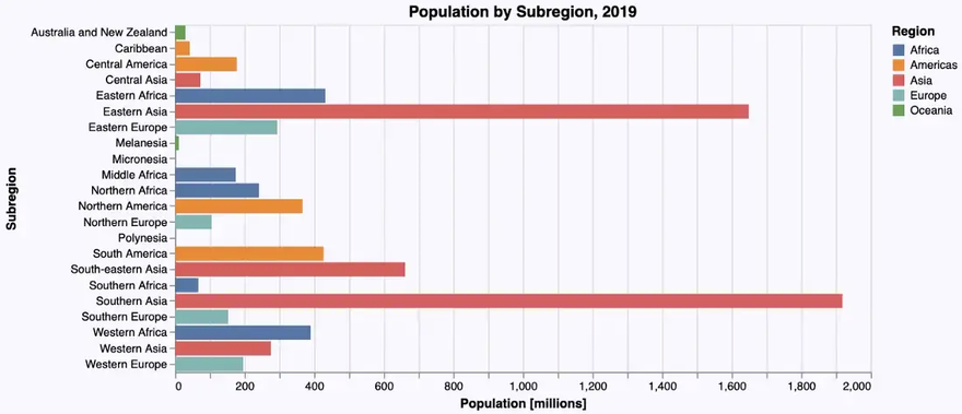 The next bar chart depicts population by subregion using the following @vlplot-command: