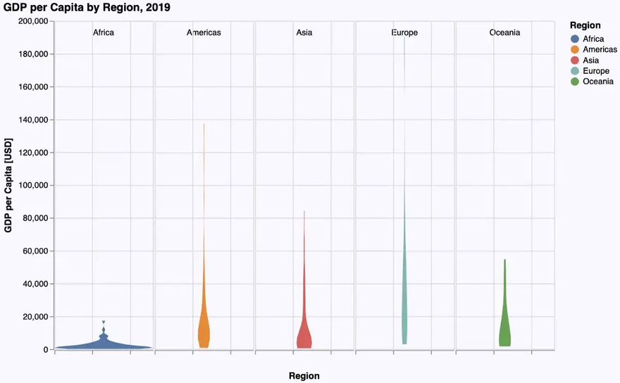 As VegaLite doesnāt support violin plots as a geometry on its own, they have to be constructed using density plots (one for each region) which are lined up horizontally. This leads to the following, rather complicated specification: