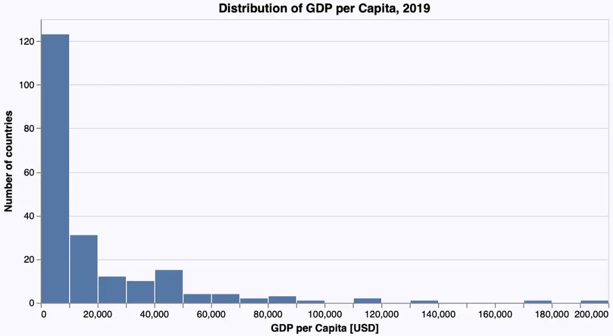 VegaLite follows the GoG strictly. So we get a histogram that shows the distribution of GDP per capita among the different countries with the following @vlplot-command using a bar geometry with the parameter bin set to true: